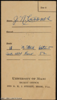 An envelope for 11 (no longer present) tickets from the University of Miami, belonging to J. N. Crooms. Included is the seat information, and on the back are handwritten notes for an address in Miami and, presumably, calculations for the cost of travel from Orlando to Miami -