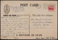 A postcard from an Eldra L. Dixon to the Crooms Family, as Dixon was stationed in Guam at Andersen Air Force Base. Dixon lists his rank as G/JC, and lists his unit as the 77th S.R.S., possibly a Strategic Reconnaissance Squadron. -