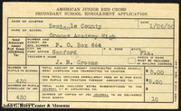 An official card application for Secondary School Enrollment for the American Junior Red Cross. The application is for Crooms Academy High. -