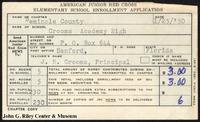 An official card application for Elementary School Enrollment for the American Junior Red Cross. The application is for Crooms Academy High. -
