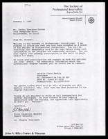Letter from Annie Carpenter Hayashi to Thelma Gorham. Hayashi welcoming Gorham to the Society of Professional Journalists. January 3, 1989.