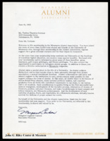 A letter from Margaret Sughrue Carlson, Executive Director of the Minnesota Alumni Association, to Thelma T. Gorham, thanking Gorham for her membership to the organization. -
