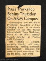 News on the 14th Annual Interscholastic Press Workshop. The piece says that Thelma T. Gorham stated that many newsmen and journalists will be guest consultants during the event. -