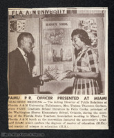 A newspaper clipping with a picture of Thelma Thurston Gorham, acting as director of public relations for Florida A & M University, giving FAMU Graduate literature to Felix Coxby during the Florida State Teachers Association meeting in Miami. -