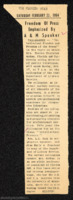 A newspaper article about Thelma T. Gorham guest speaking at the Baha'i fireside. She was speaking on the topic of “The Challenge of World Unity”. The newspaper article goes on to further explain the beliefs of the faith. -
