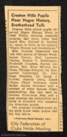 A newspaper article about Negro History Week in Creston Hills. Mrs. Richard R. Gorham spoke to the students on the subject of “Negro History and Brotherhood.” She spoke of different historical Black figures in history. -