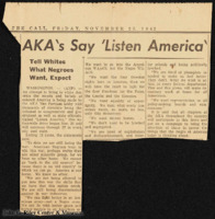 A newspaper article detailed Alpha Kappa Alpha Sorority members describing their desire for equality in the United States. "Listen America" is an attempt to capture white American's attention to help fight against racism in war efforts. -