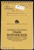 A notebook of handwritten notes by Thelma T. Gorham. The notebook includes notes and entries about education, notes on short stories and novels related to African Americans and army life, as well as poems. Tucked into the notebook are pages of a typed story with handwritten edits and newspaper clippings about segregated cafeterias, newspaper hate ads, and a Mississippi executioner.